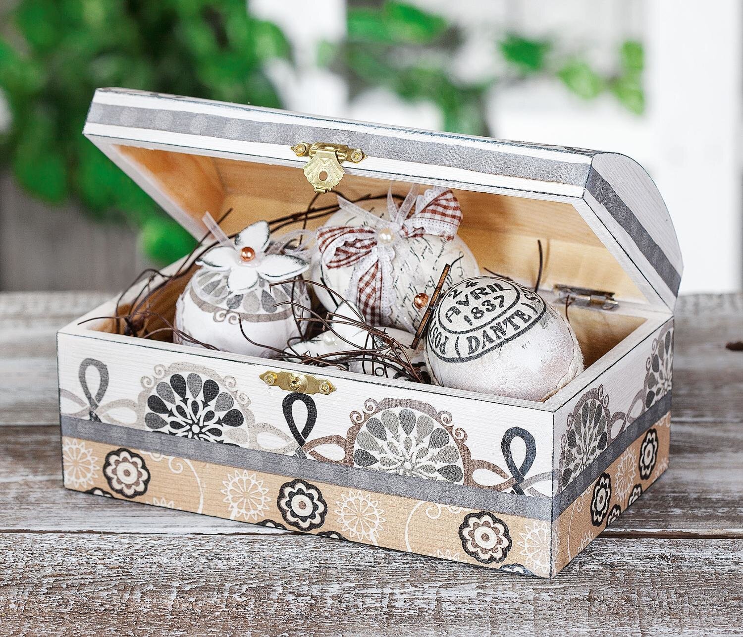 Prime the Terracottaeggs with VBS Hobby Color in white. You glaze the wooden chest by sponging white VBS Pick up Hobby Color and wipe it evenly over the chest.