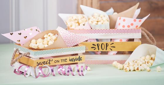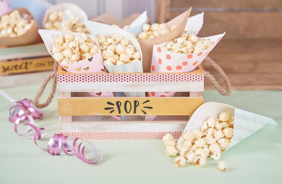 For our stylish popcorn boxes, take a decorative wooden box, paint it in your desired colors, here for example in beautiful pastel colors with our Handicraft paint Hobby Color. You can also write on the boxes and stick Washi Tape over them For the popcorn bags you can choose our beautifully assembled sets or make them yourself from beautiful paper.