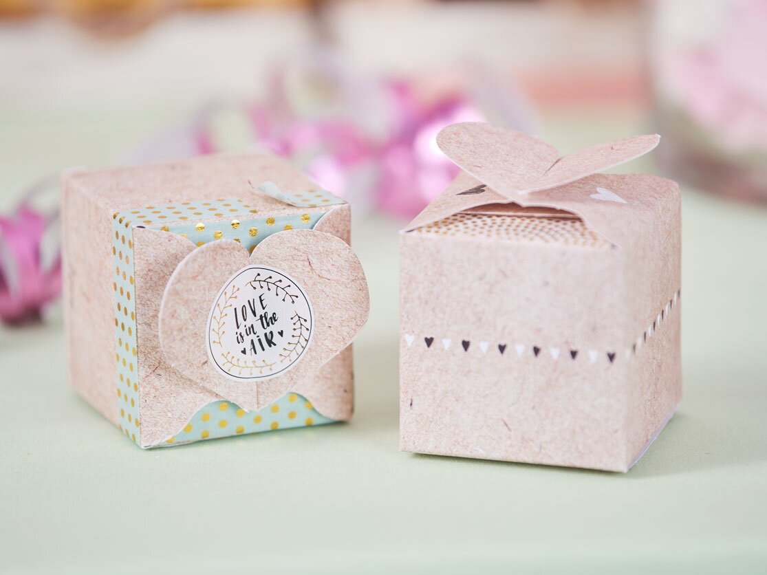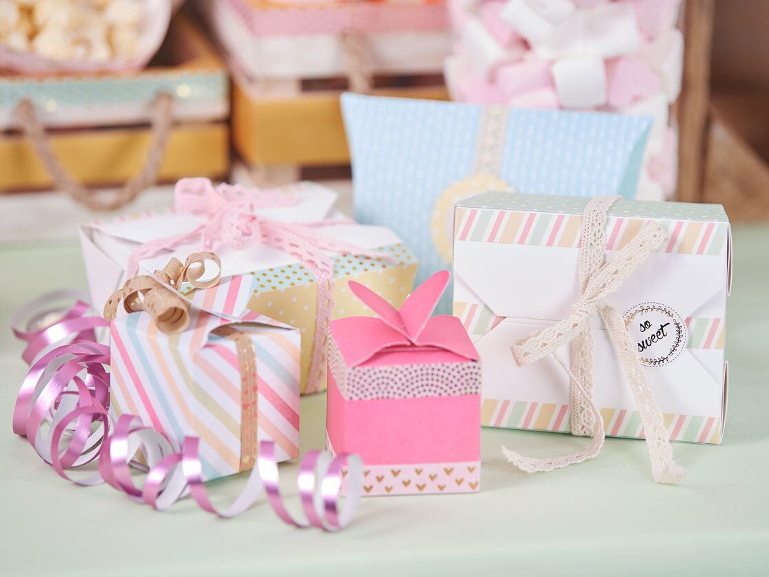 You can easily make boxes in different sizes and colours. We offer you a wide range of sets, templates for boxes, punching sheets for boxes and much more. Labels, tapes, Washi Tape and stickers can be used to create beautiful effects and you can customize the boxes to suit the occasion and your chosen colour theme.