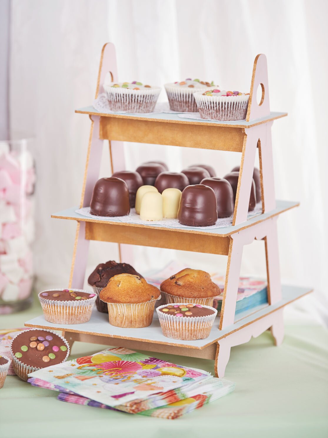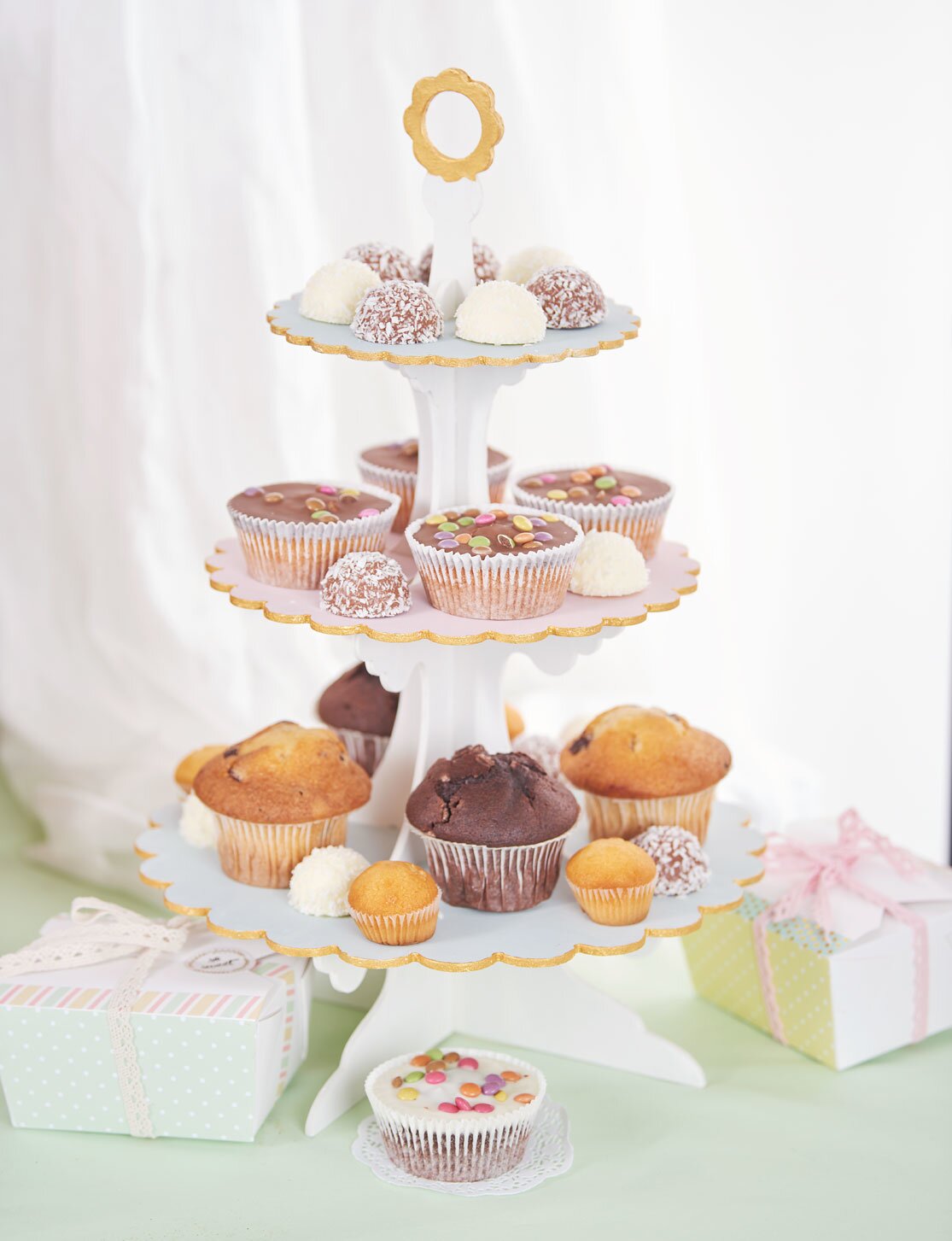 For the presentation of muffins, cupcakes, cakes and other treats, pastry stands such as Etagere and cupcake stands are particularly suitable. These can be beautifully designed with a little colour and Decoration material .