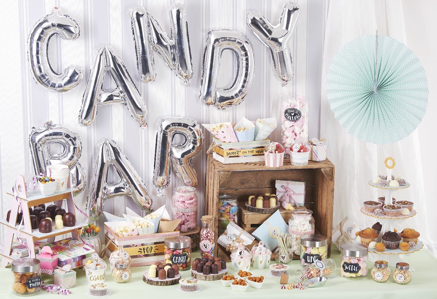 Last but not least your Candy Bar will be decorated with party decorations. You can use balloons, Napkins, streamers, confetti and much more. - Give your creativity free rein. Your party can come - and the Candy Bar is guaranteed to be an eye-catcher!