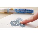 Simply write a text with the pen or paint over the area to be protected, let it dry for a short time and then apply Watercolour paint over. Let everything dry and rub the raised areas with your finger. This creates a white text, or a white area in the middle of Watercolour. The pen can be used for accurate and sharp-edged lines, but also for larger areas, depending on the thickness. As it dries very quickly, you can simply rub it off afterwards without leaving any residue.
