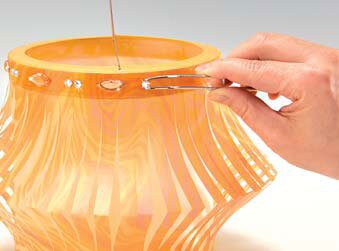 The Lamp foil stick with tape-Ribbon from the inside to the lantern base and lid. On the outside you also stick on tape-Ribbon . Attach the narrow end of the transparent paper to the lid and base at the same time and stick it firmly in place