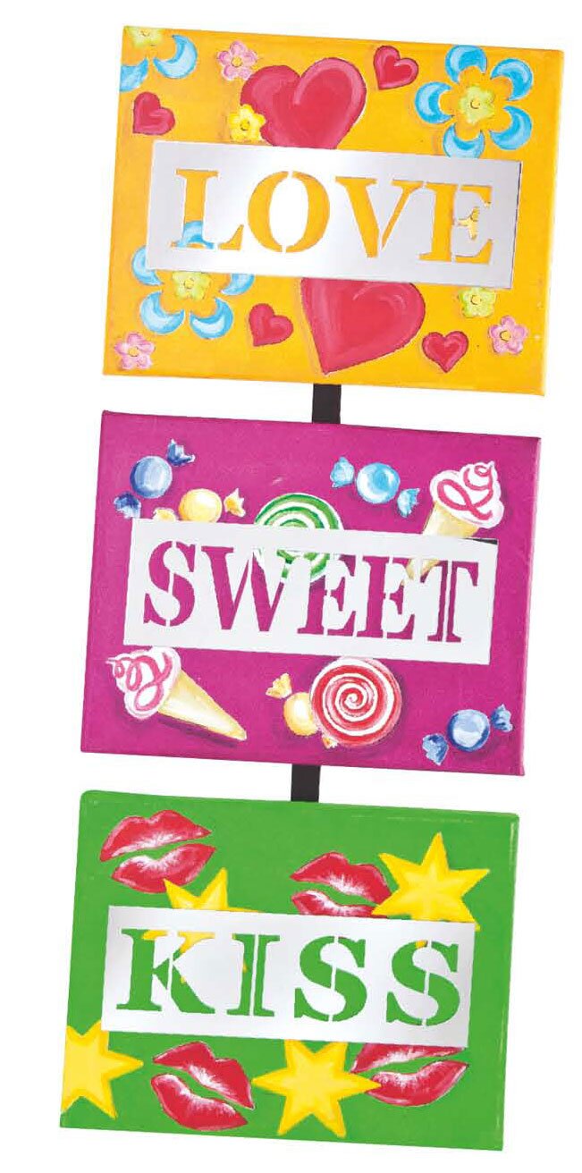 For this handicraft idea 3 of the Stretched Canvas size 24 x 30 cm are needed, colorful as well as the mirror motive Acrylic paint "Love, Sweet, Kiss".