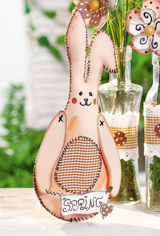 The individual foam rubber parts of this rabbit are not glued but sewn with simple visible stitches. First, transfer the individual parts of the rabbit from the template with a soft pencil (the body is needed twice) and cut them out. Paint on the front body of the rabbit with a black Pearl Pen the face. With something Handicraft paint in Terracotta two dots are dabbed on as red cheeks. Take some Terracotta-colour on a damp soft sponge and wipe carefully over all Foam sheets-edges. On the belly a curl can also be placed as a shade.