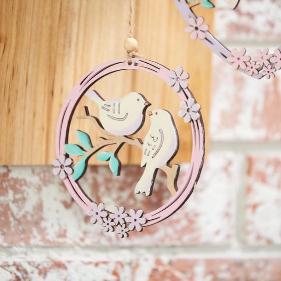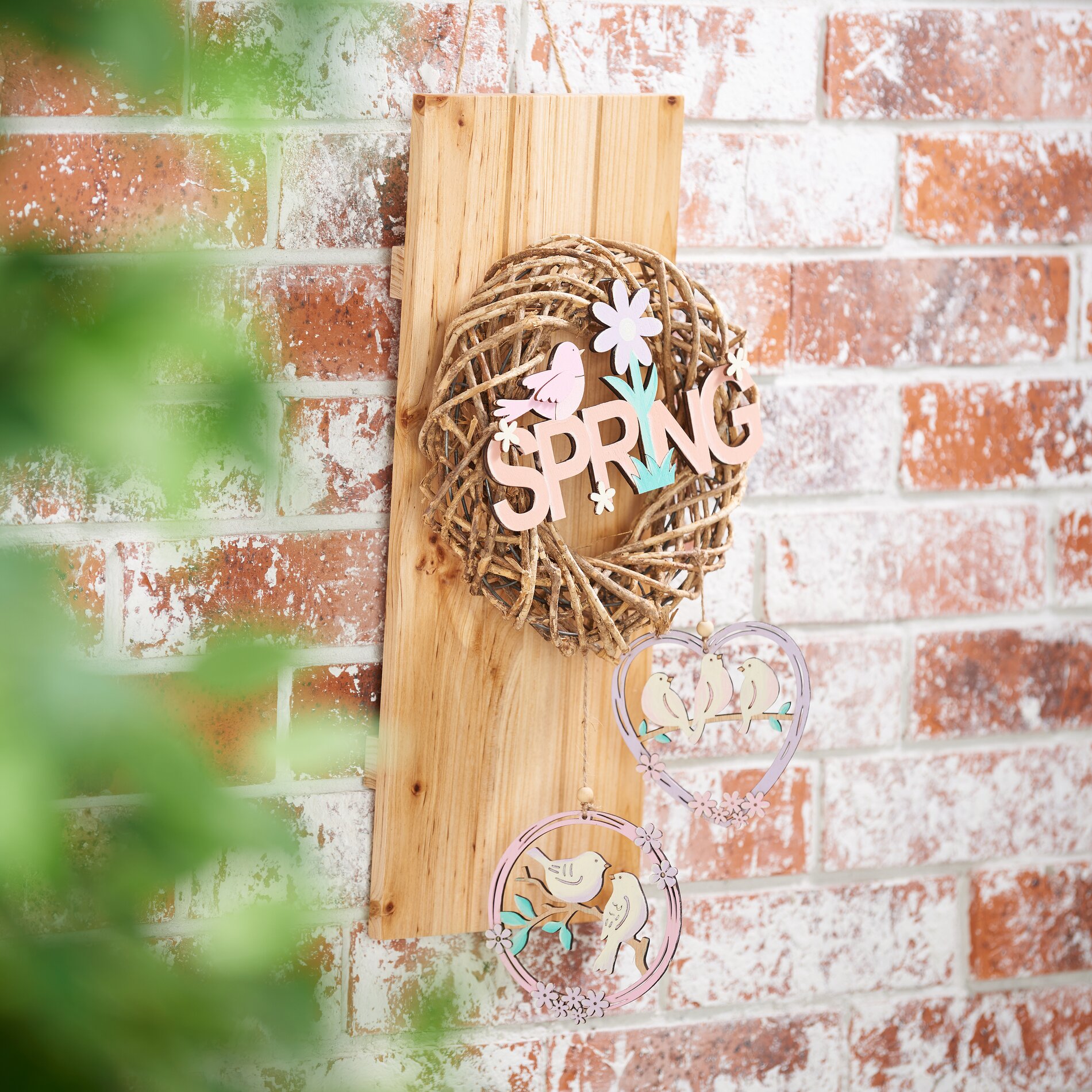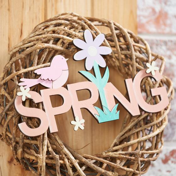 Now that the wreath is hanging, you can knot the wooden lettering and the painted wooden pendants to the wreath.