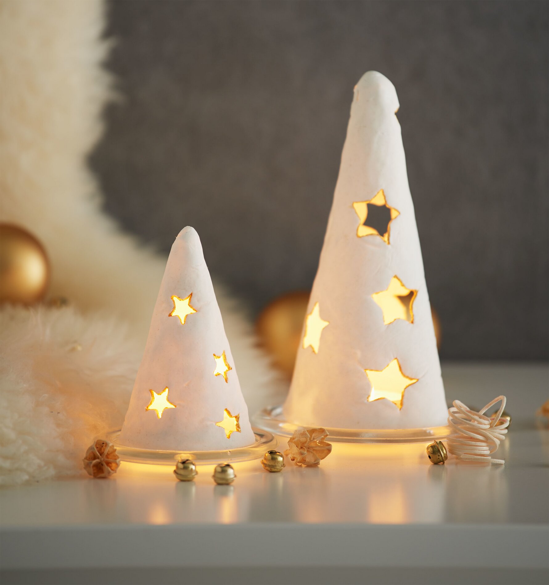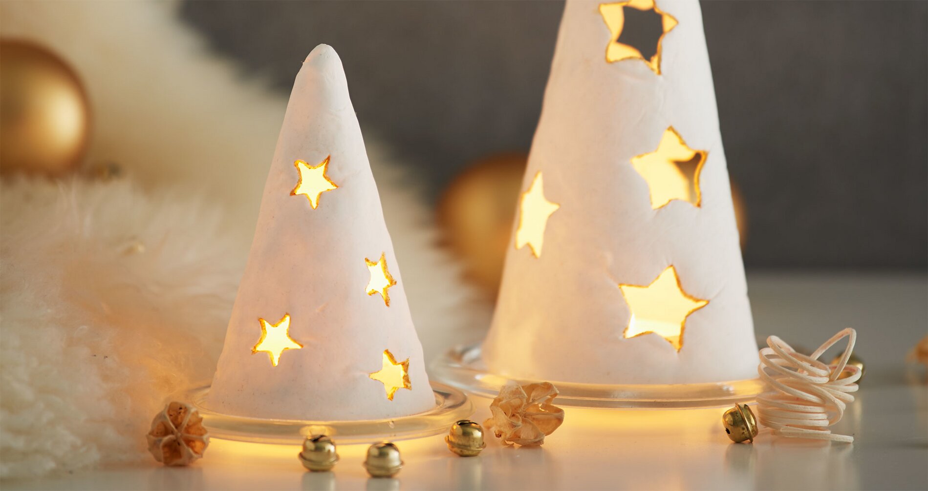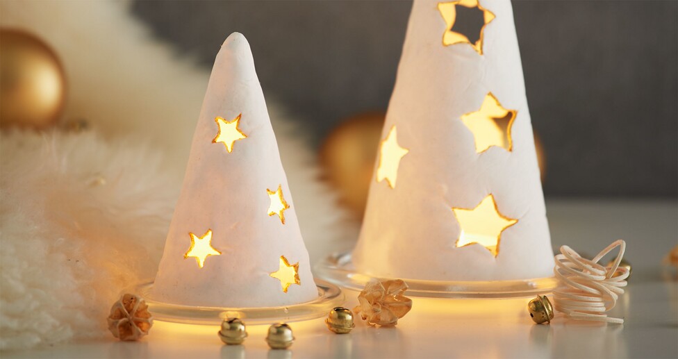Pre-knead the Modelling clay into a smooth mass according to the product instructions and then use the acrylic roller to form a flat modelling dough. Place the motif templates on this dough sheet and cut out the corresponding shapes. Remove the stars with cookie cutters. Wrap the modeled sheets around the polystyrene molds, moisten the ends with a little water and join the edges together until there is no seam left