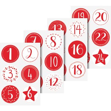 Cute stickers "Advent numbers"Winter Joy with red foil finish. The stickers have a Ø of approx. 5 cm. You receive 24 stickers on 4 sheets.