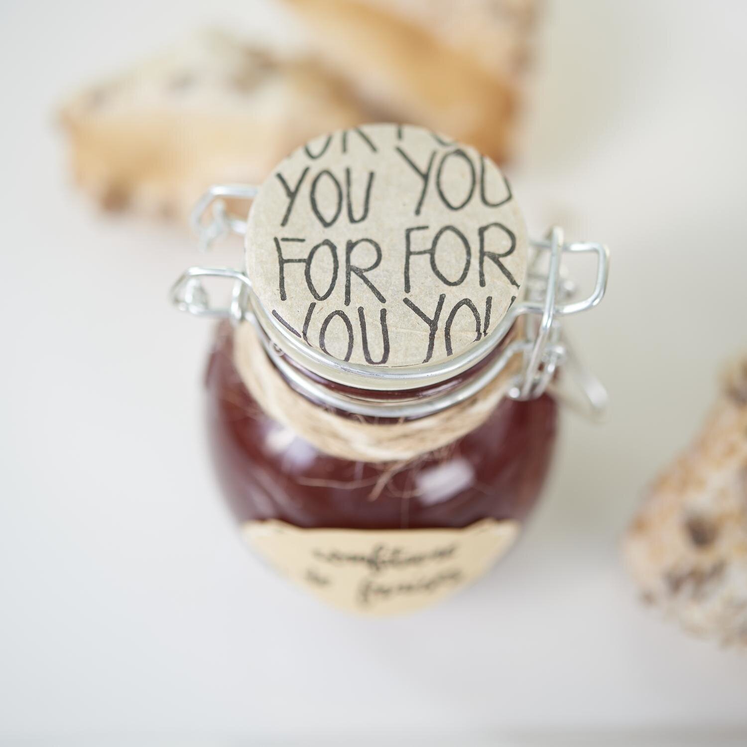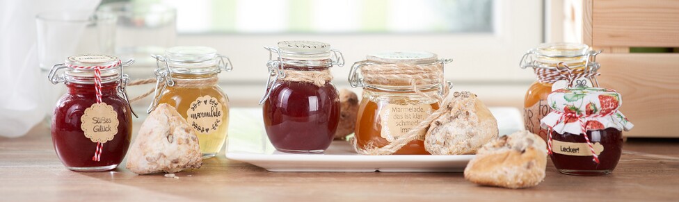 It looks especially nice when you decorate your jam jar. An eye-catcher are labels that are printed with a nice writing or that you can write on yourself. With matching ribbons and Napkins fabric lids, the jars also look great as a gift.