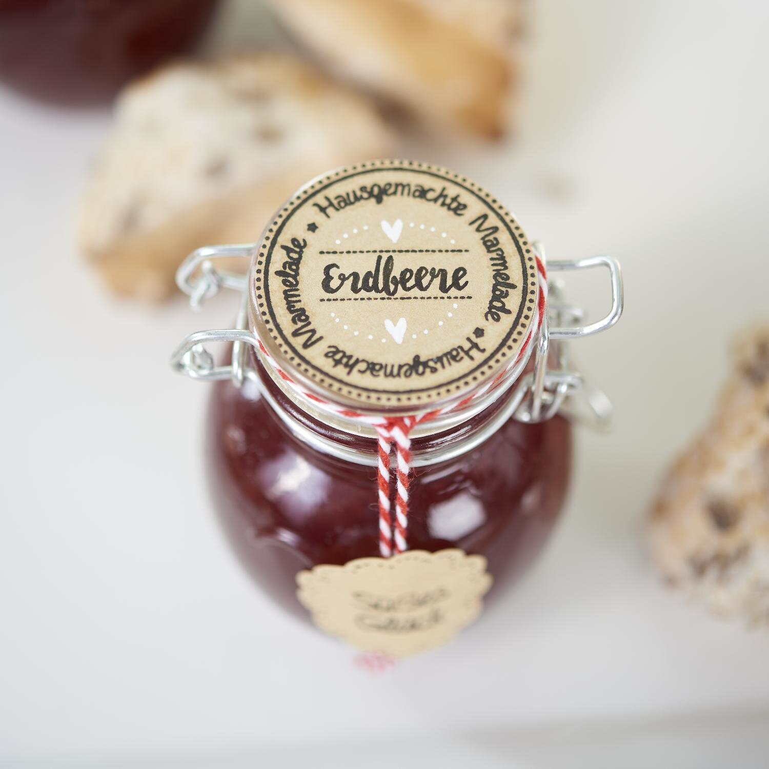 Who does not like them - the strawberry jam! Delicious, sweet and perfect on the breakfast roll. With our recipe you can create the sweet spread and then wrap it up nicely. With labels, matching ribbons and decorative pieces, your jam jar will be an eye-catcher. A great idea also as a souvenir.