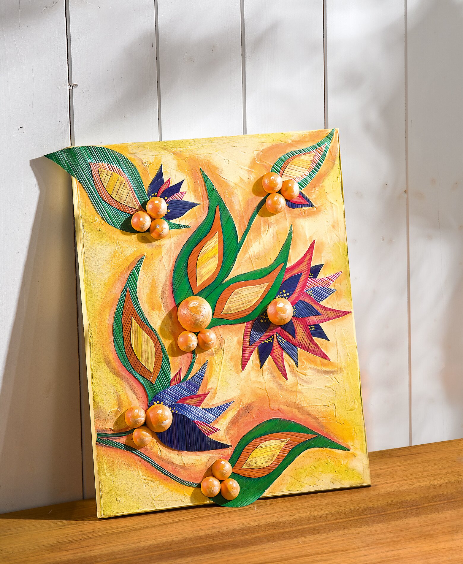 You probably think of the term "handicrafts with straws" when you hear the term "straw handicrafts". These Straw stars.classic handicrafts hang in many Christmas trees and decorations every year at Christmas time. But the great straws, which the trade offers in natural and colorful colors, can do much more. On this Stretched Canvas one they are combined to big, colorful motifs and create a great look where you have to look twice to see the material.