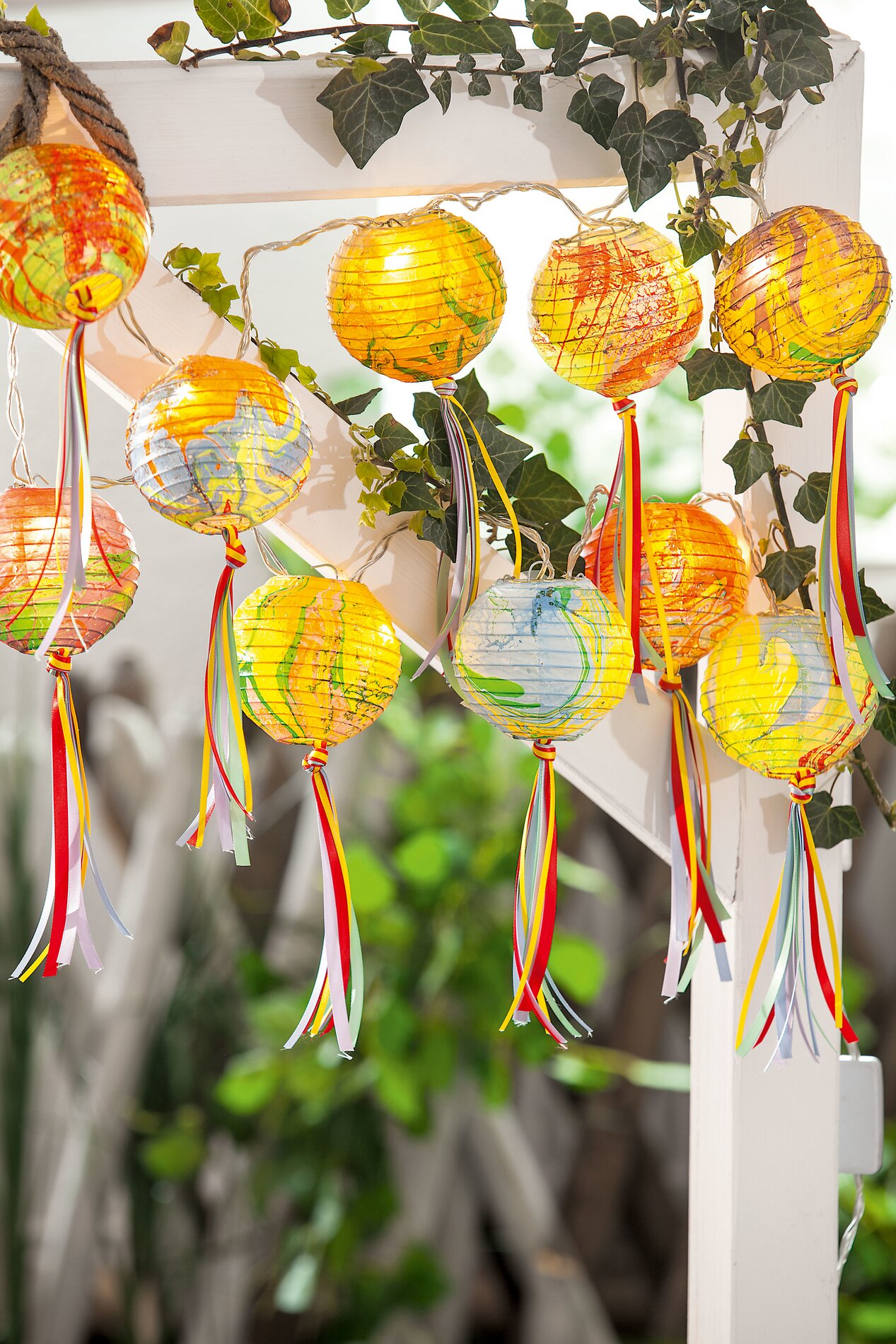 Dribble three marbling colours per lantern onto the surface and draw a pattern with a wooden stick.