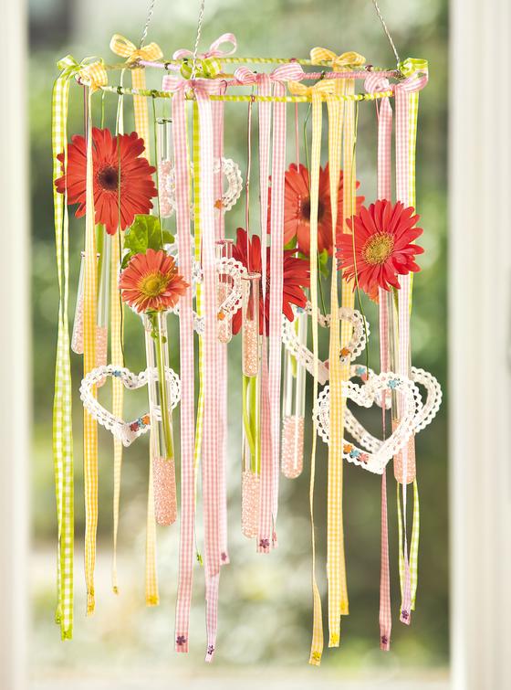 Wrap the test tubes at the upper edge with deco aluminium wire and fix them in different lengths to the metal ring.