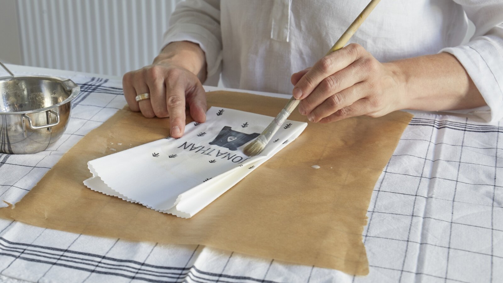 Use a slightly wider brush to apply the wax carefully and as evenly as possible. To prevent the bag from sticking completely, we recommend placing a suitable strip of baking paper in it beforehand.