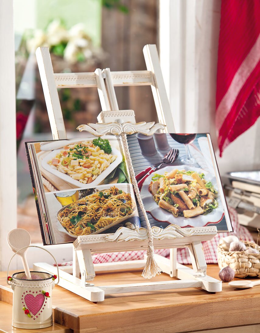 Practical: On this cookbook stand, the recipe stays open exactly on the page you need for cooking. The timeless country house look is created by playful bobbin lace and MDF decors, which are simply glued on, and by the dark wiped edges.