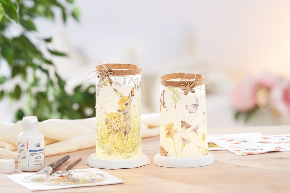 Remove the bottom unprinted layers of paper from your napkins, so that you only have the printed layer in front of you. Coat the lamp foil with napkin varnish and place your napkin motif as smoothly as possible on the foil. Then use the brush to apply another layer of napkin varnish on top of the motif. Make sure that everything remains smooth and that there are no bubbles.