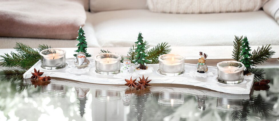 Now apply the decorative snow with the Spatula on the Tealight holders and the tea light glasses. Place the figures in the still wet decoration snow and let everything dry well.