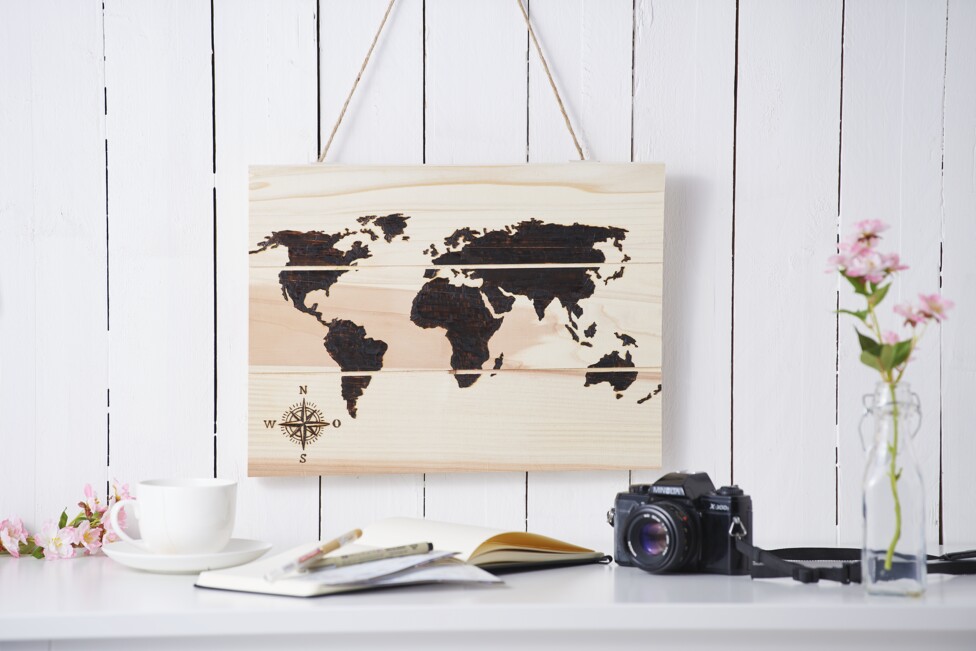 Now the preparations are finished and you can start with the Wooden burning begin. Now trace the outer lines of the world map with a thin tip. Make sure that the branding pen is hot enough at the beginning. If possible, hold the branding pen on the only black rubber, because the lower part gets very hot and you can otherwise quickly burn your fingers. As soon as you have painted all lines, a wide tip is needed for colouring in large areas. You should pull out the branding penPlugs from and let it Wooden burning pen accessoires cool down. You can easily change them Lace by turning them out and in. Tip: You can also use pliers to Lace change them. Finally, simply colour the rest of the world map with the branding pen. For the compass rose, proceed as described above. As the rose is very delicate, we recommend using the thin tip of the Brandmal pen.