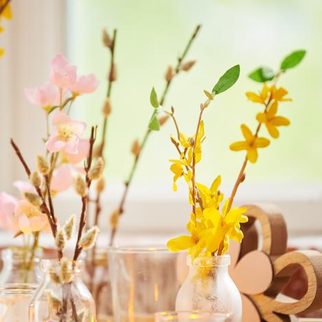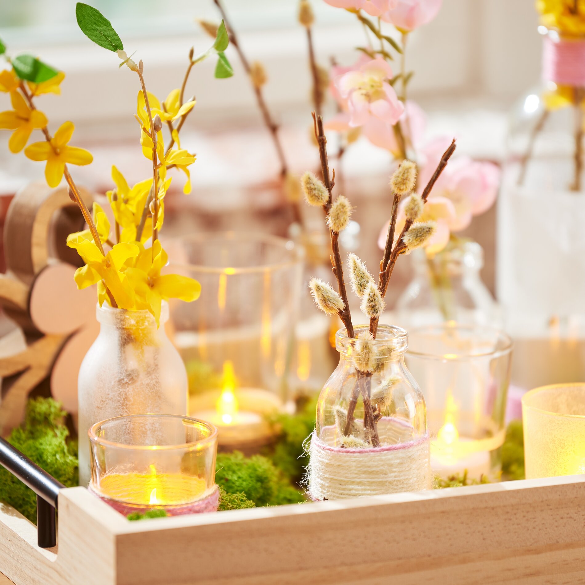 Fill the vases with some colored sand (for a firmer stand). Trim the artificial flowers with the side cutter and place them in the vases. Place tea lights in the tea light jars and arrange everything on a tray.
