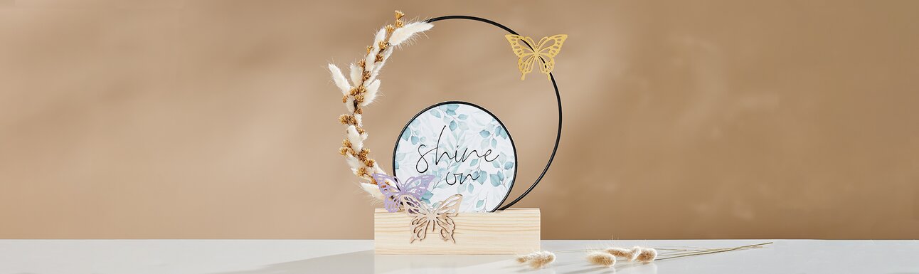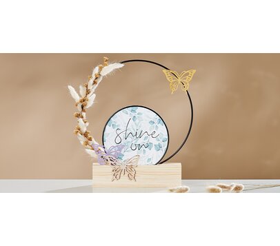 Transform plain metal rings into impressive decorative elements for your home. With artificial flowers and plants, dried flowers, decorative pendants, wooden balls, ribbon bows and much more, you can give your metal rings their special look.