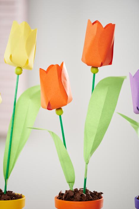 Transfer the motif templates to the corresponding folding sheets: the large flowers go on the colorful folding sheets, the small ones on transparent folding sheets and green folding sheets are optimal for the leaves. Cut everything out, fold the leaves lengthwise in the middle.