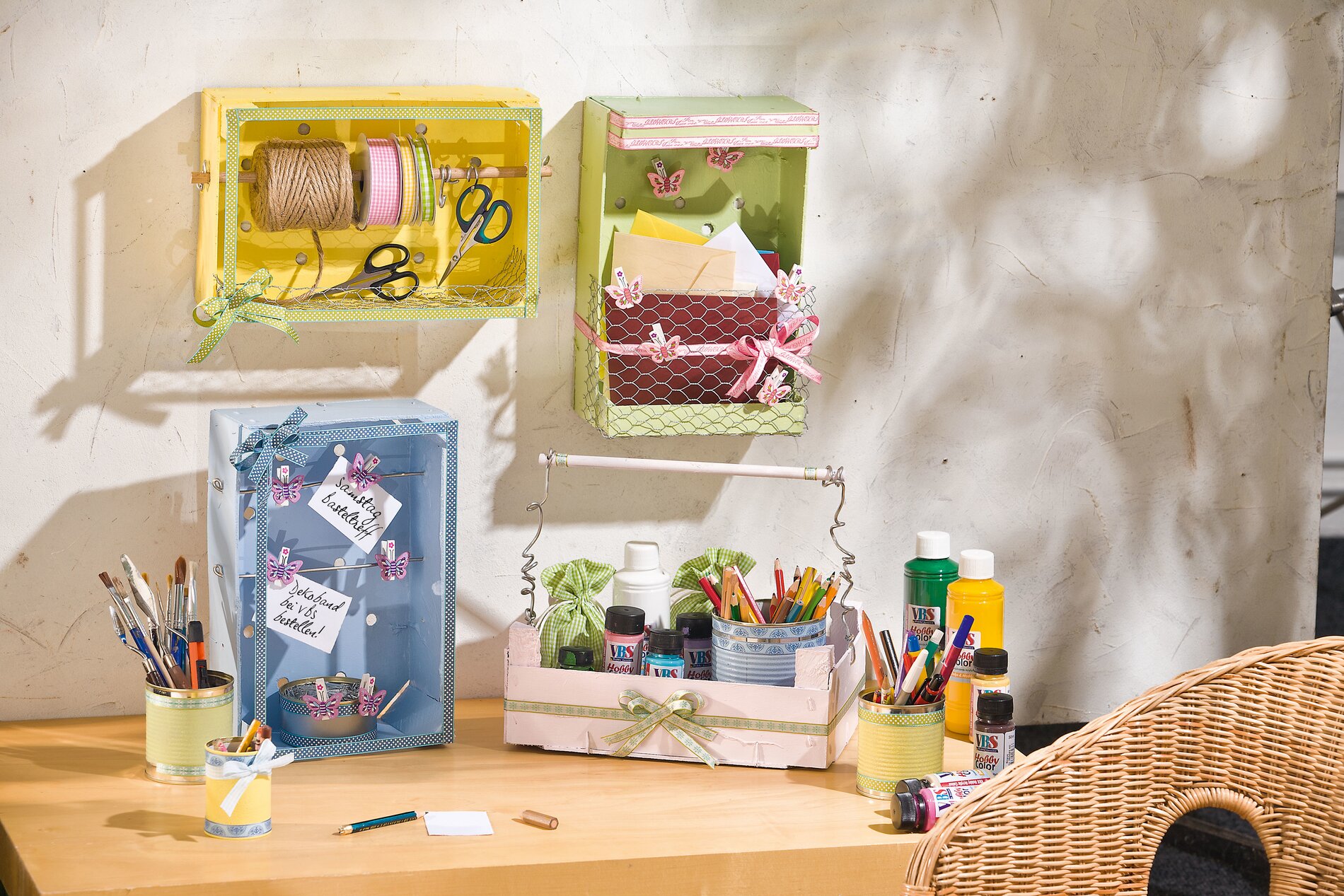 Used tangerine crates are far too good to throw away. Make them practical Organizer for the crafts table. Paint, aluminium wire, round rods and a few pretty ribbons - that's all you need. And if you still have a few tin cans left - you can also convert them into great things.