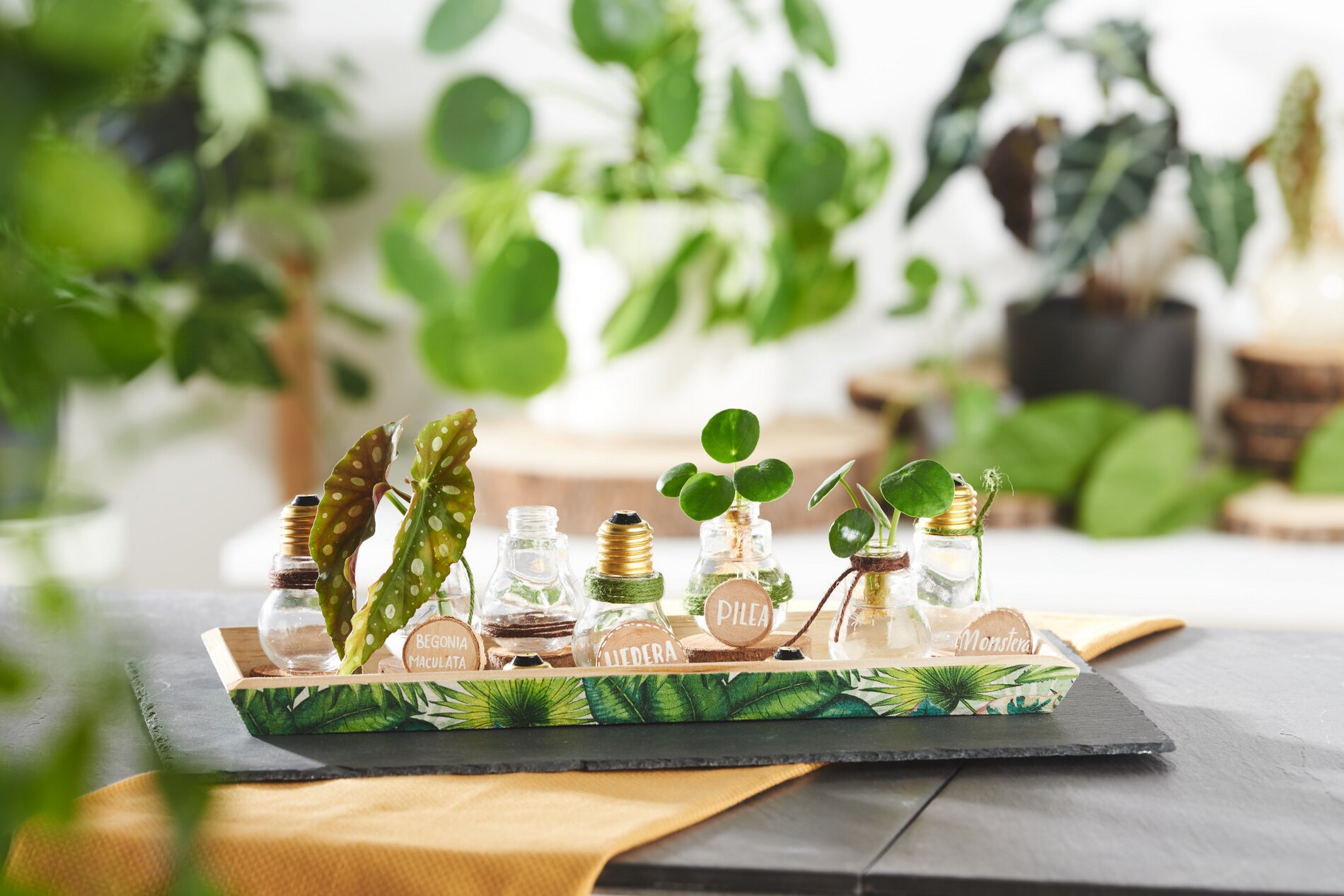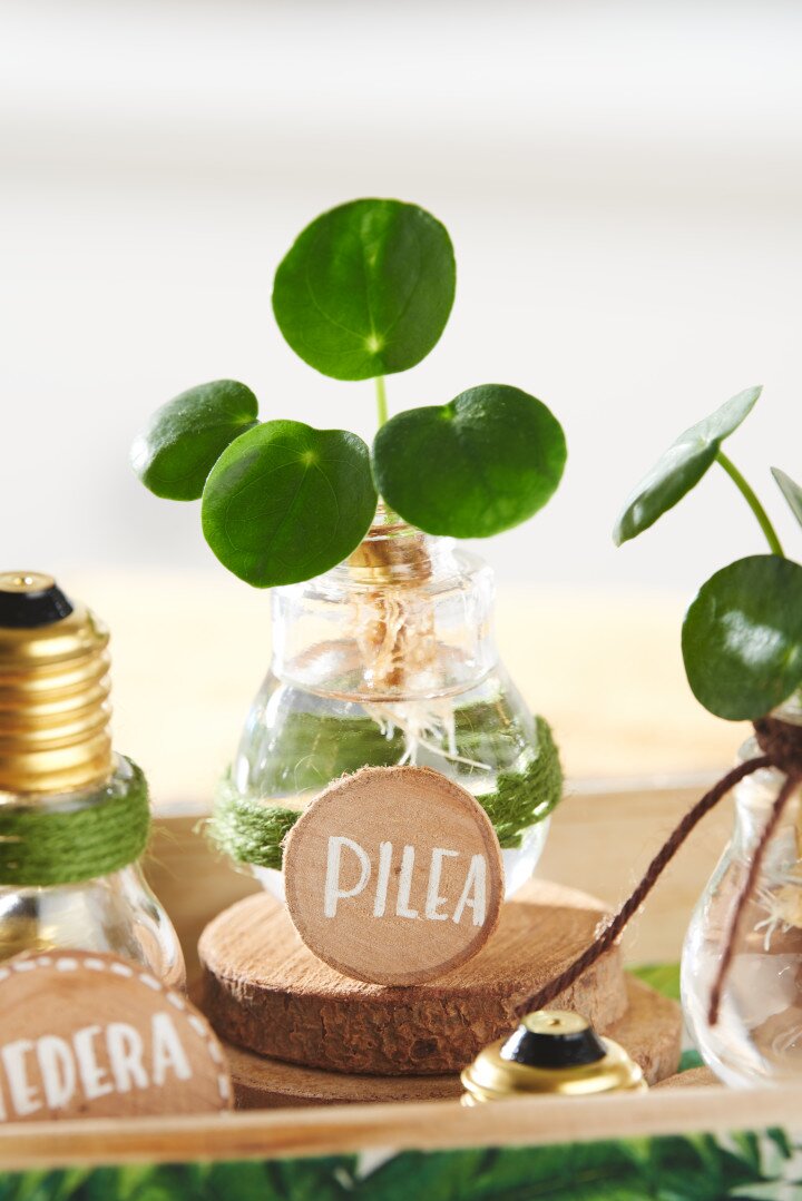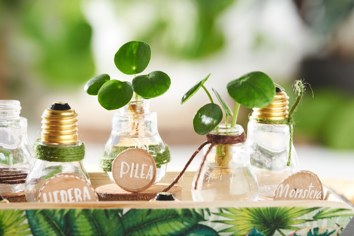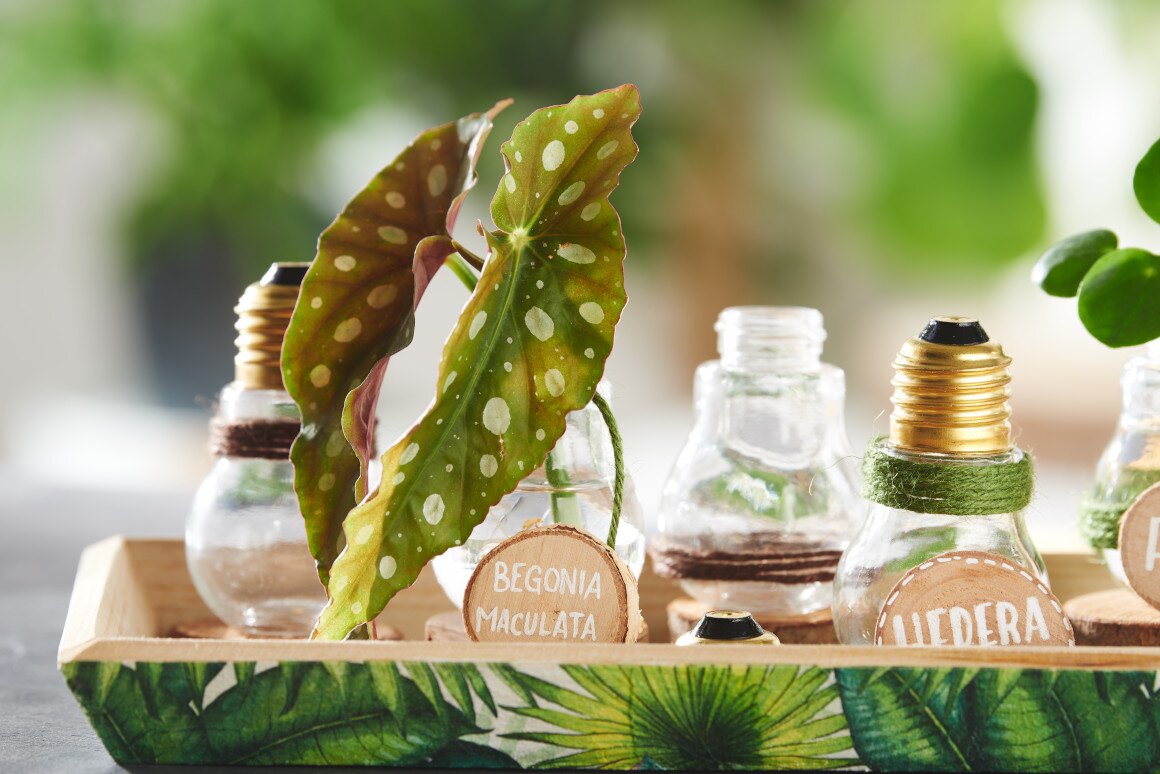 You want to grow new green plants from cuttings? Our plant growing station is practical and decorative at the same time! The pretty decorative bulbs can be screwed on and find a place as mini-vases on the wooden tray decorated with napkin technique. Everything is very quickly tinkered.