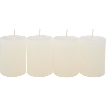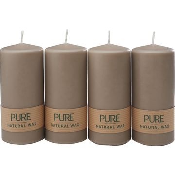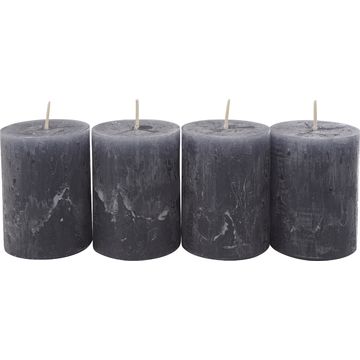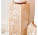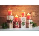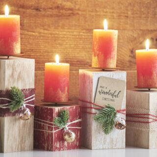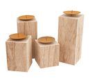 VBS Wooden candleholders in a set of 4 with a length and width of 8.5 cm in the heights 12 cm, 15 cm, 20 cm and 23.5 cm (measured including the mandrel). Equipped with rust-coloured candle plates with mandrel for pillar candles. The plates have a Ø of 7,5 cm
