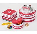 VBS Cardboard boxes "Round" in White as a set of 12 pieces. Variety of boxes made of white cardboard in different sizes as a value pack. The dimensions of the boxes vary from diameter of about 15 cm and height of about 8 cm to diameter of about 4.5 cm and height of about 2 cm. Therefore, the boxes can be stacked on top of each other or placed inside each other.