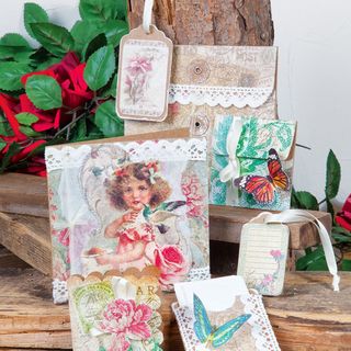 Tinker and design the cards for example with Straw silk paper Pearls, Lace ribbon punching, etc. Make friends with a card you have designed yourself or decorate a gift with a label you have designed yourself. The card set is very versatile and especially suitable for your handicraft idea in vintage design