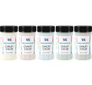The VBS Chalky Color "Basic" set contains five great colors of 100 ml each in the colors Vanilla, Antique Pink, Sky Blue, sea Green and Antique Grey. For a unique shabby chic look, simply apply the Chalky Color paint to a raw wood object or a sanded old furniture and get a fresh color effect.