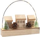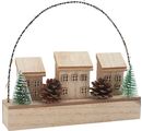 An enchanting VBS Complete set "Winter village with light arch" with a size of approx. 20.5 x 4.3 x 17.5 cm. A set including lighting with 2 CR 2032 batteries. The winter village is assembled from 23 parts by you. Here, the 3 loose houses are glued on the base / base plate, the windows for gluing on the houses are included. A bent wire for the enclosed string of lights is inserted into the pre-drilled holes. For the fir trees, the holes are also pre-drilled. The cones are decorated and glued on by you.