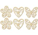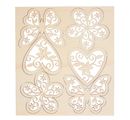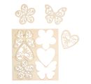 6 pendants "Flowers, hearts and butterflies" with ornaments for individual design. These beautiful pendants have a diameter of approx. 7 - 8.2 cm and a thickness of 3 mm. The spring motifs are made of high-quality plywood. 3 different motifs à 2 pieces.