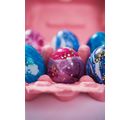 To marble the eggs, all you need is a bowl of water and various colors. Drop the dyes into the water and use a toothpick or needle to draw patterns in the paint. Carefully dip the egg into the water and leave it to dry. We recommend using weatherproof craft paint and brushes for painting so that the eggs look good outdoors too. Let your creativity run wild and design your eggs to suit your taste.