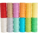 These 12 spools of hemp cord have a weight of about 50 g each and are a colorful assortment of different colors as an advantageous package. The material is dyed hemp fiber.