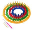 Knifty crease knitting rings, 4 pieces with Ø ca. 14 cm, 19 cm, 24 cm, 29 cm, 2 Needles, 1 hook needle and a knitting instruction. High quality material and super processing. The rings have special grooves on the outer bars, for easy lifting of the stitches.