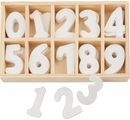 An assortment consisting of 60 numbers from 0-9. They are approx. 3 cm high and approx. 1,5 cm - 2 cm wide. The wooden numbers are already primed white and can be glued directly onto your decoration. Thanks to the wooden box the numbers are clearly sorted and always ready to hand.