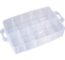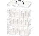 A practical storageVBS box with handle. The stacking box consists of three levels and a lid. The size of the box is approx. 24.5 x 16.5 x 18 cm. The material is transparent plastic. A handle is attached to the lid for easy transport of the box. On the sides the boxes are joined together with a click lock. Each of the three levels has a division with 10 compartments. The compartments can be enlarged by removing the partition. The size of one compartment is approx. 4.8 x 8 cm.