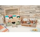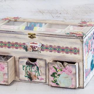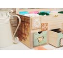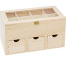 In this tea chest you can sort your tea bags in 8 chambers. Thanks to the glass window you always keep the overview. The 3 drawers offer space for more tea, tea bags or accessories. Once the tea box is filled with your favourite teas, it will quickly become an indispensable utensil in your kitchen or office. The teebox wood can be easily painted or covered with paper.