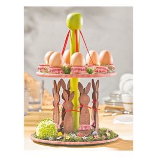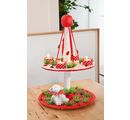 Very decorative tealight holder in the form of a shelf, the height of which can be individually adjusted with the help of the satin ribbons. You can decorate the decorative plate with sweets or small accessories and figures. The upper plate has four recesses, in which tealights and tea light glasses can be placed. Design this home accessory and discover the many decoration possibilities of this article.
