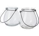 VBS Wind light made of glass with a height of approx. 10,8 cm and a Ø outside of approx. 10 cm. You will receive 2 lanterns. The opening at the top has a Ø of about 5.5 cm and the footprint is about 6.5 cm. At the top of the rim is a wire hanger attached with which the wind light can be hung.