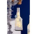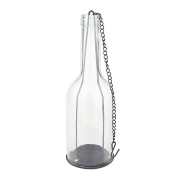 The clear glass VBS Wind light-bottle has a height of approx. 29 cm and a base diameter of approx. 7.5 cm. Inside the bottle is a metal frame on which a tea light is placed in the lower part. The bottle is hung up on a metal chain, which Chain has a length of approx. 27.5 cm.