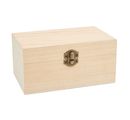 A pretty VBSwooden box made of pine wood with a size of approx. 13 x 8 x 6.3 cm. The inside dimensions of the box are approx. 11.4 x 6.3 x 4 cm and the lid is approx. 1.4 cm high. On the back are 2 metal hinges and on the front is a nice little metal clasp
