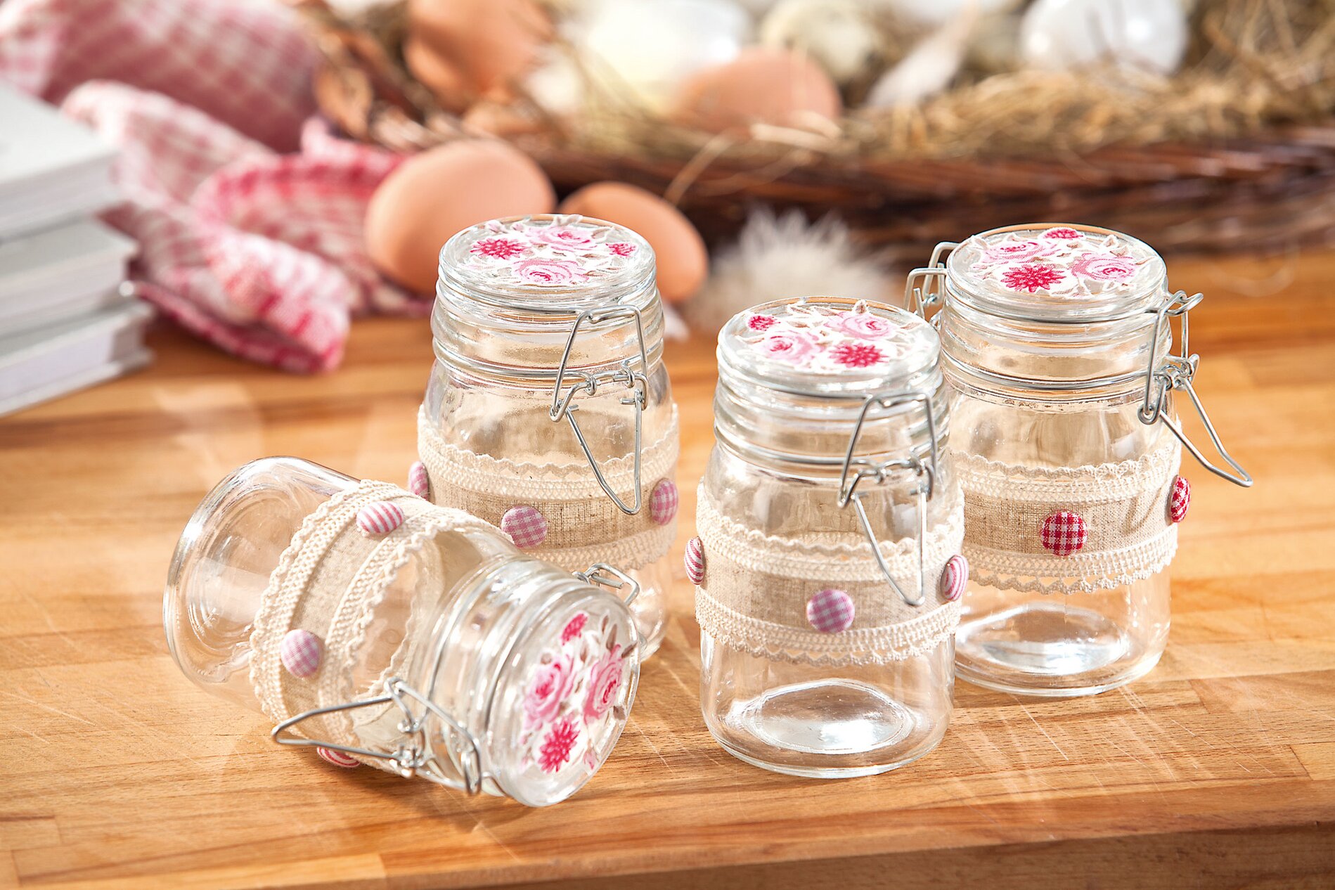 For the lids, cut out matching rose motifs from Cotton fabric and stick them on with UHU Contact power glue. To seal the lids, apply another layer of glue to the lids only Napkin varnish.