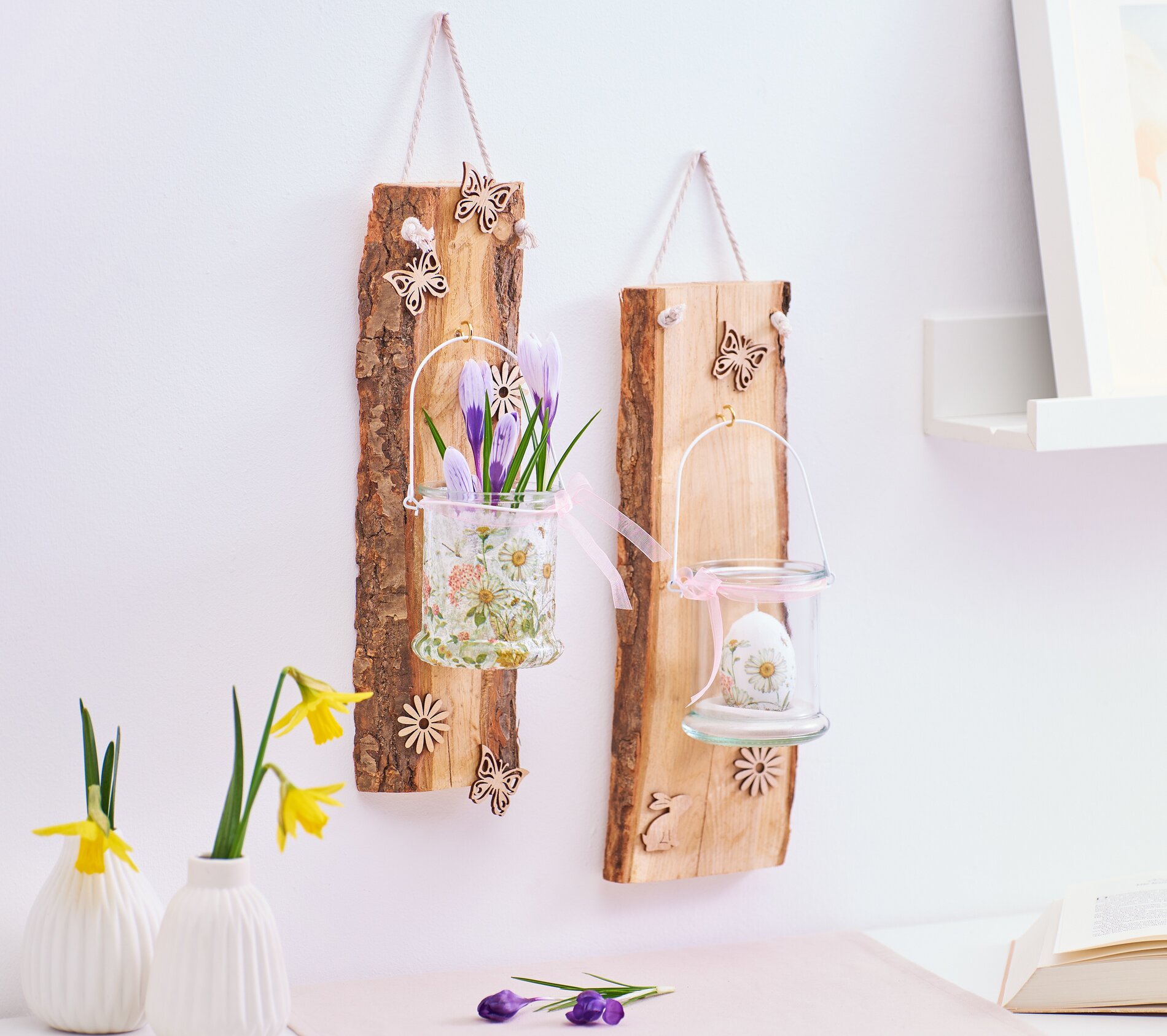 First, drill two holes in each of the two oak rind boards. Pull a cotton cord through the holes and knot the ends to create a stable suspension. Screw a screw hooks into each board so that you can later hang one glass lantern on each board.