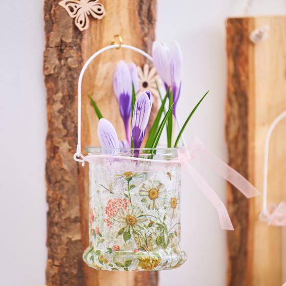 Take a motif handkerchief of your choice and unfold it, then cut it in half. Coat the outside of one of the glass lanterns with napkin varnish for glass and porcelain. Remove the top, printed layer of the handkerchief from the remaining layers of paper and carefully place it on the glass. Dab napkin varnish over the motif again. Once dry, you can remove any protruding edges. The varnish can be baked at 160°C for 30 minutes. The glass can then be wiped clean. Plant a pretty spring or summer flower in the finished glass.