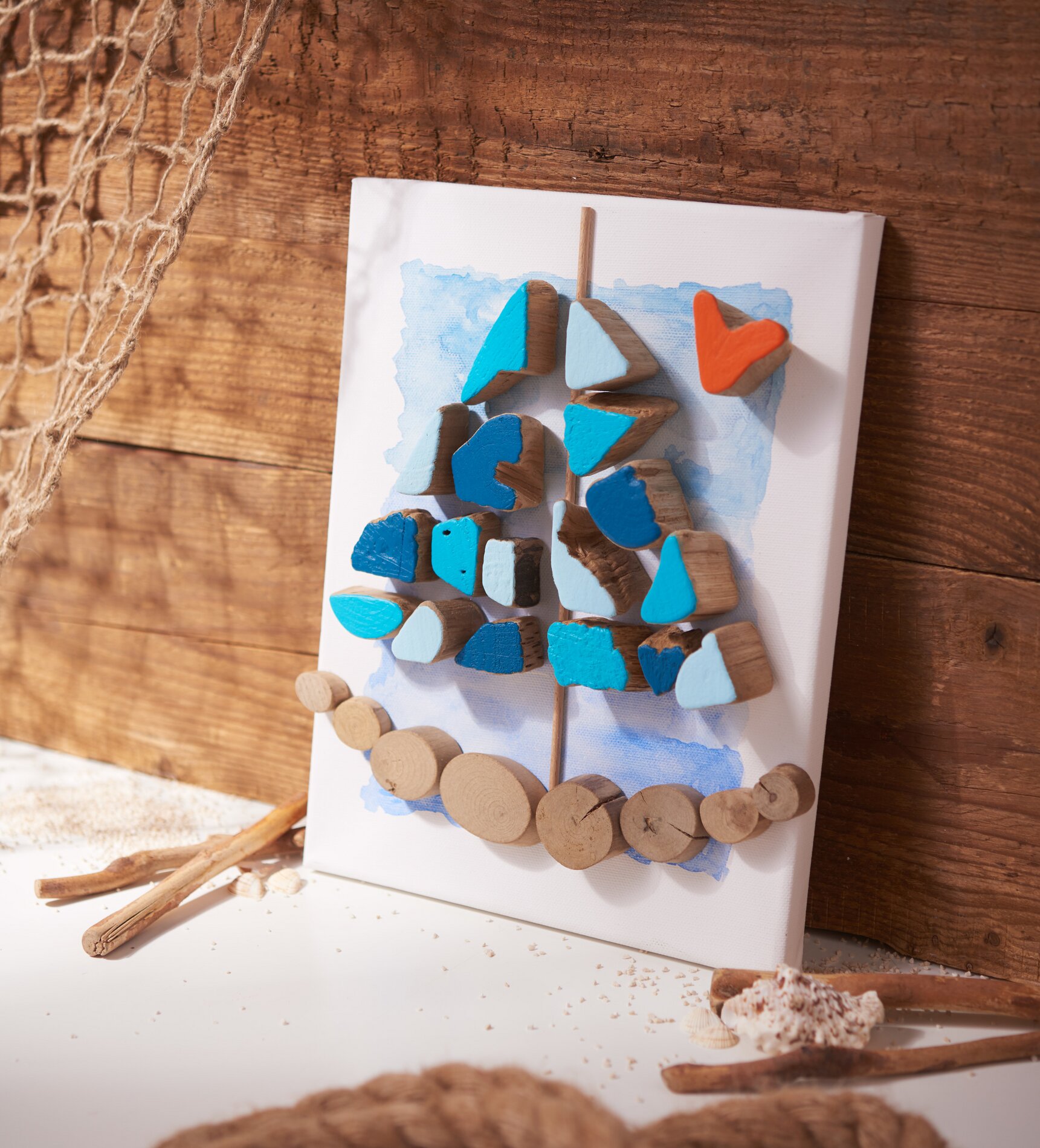 paint the surfaces of the wood in different shades of blue. To give your picture a harmonious colour contrast, use orange paint to turn another matching piece into a flying seagull.