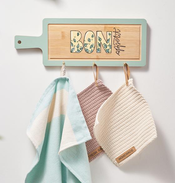 Give your kitchen an update with this decorative wall shelf! Practically decorated in natural colors, it is the ideal storage station for your towels and potholders.