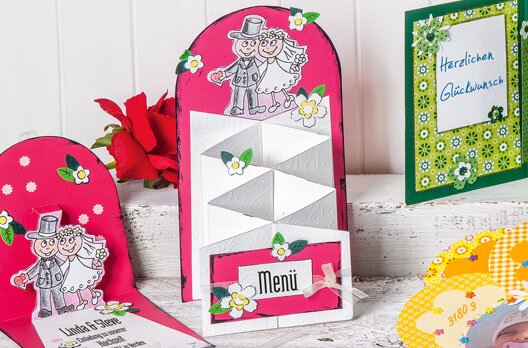 Forthe lower cascade field, cut out small sections from Coloured paper and embossed cardboard and glue the large section on .Cut two chiffon tapes about 25 cm long and glue the ends right and left on the white embossed cardboard on the back of the cascade. Use the tape-Ribbon..Nowplacea chiffon ribbon of approx. 30 cm length on the pink cutout and stick the smallwhite embossed cardboard over it.To decorate, punchout the flowers from Coloured paper , fix them on the card, outline them with a marker pen and paint the leaf structure.