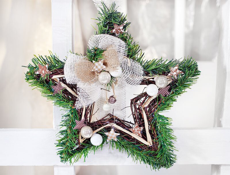 This star from Willow with its harmonious colour scheme is completely natural. Effectively placed Nature-elements like Fir and Jute are particularly effective here. Classic Christmas-Article, like the baubles, conjure up a festive atmosphere and transform this wreath of stars into a modern Advent arrangement or even a wonderful door wreath.